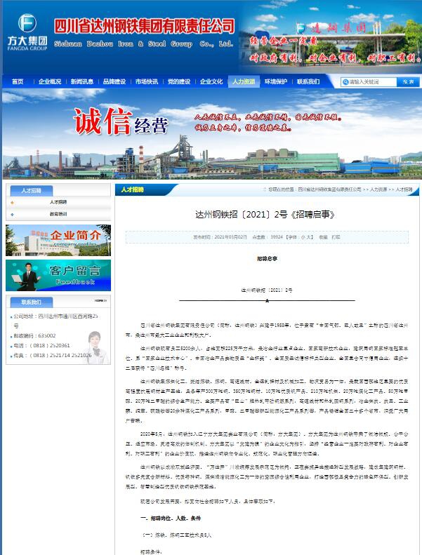 達(dá)聘網(wǎng)(www.0818rc.net)達(dá)州人才網(wǎng)訊,四川省達(dá)州鋼鐵集團(tuán)有限責(zé)任公司(簡稱:達(dá)州鋼鐵)興建于1958年,位于素有“中國氣都、巴人故里”之稱的四川省達(dá)州市,是達(dá)州市最大工業(yè)企業(yè)和利稅大戶。