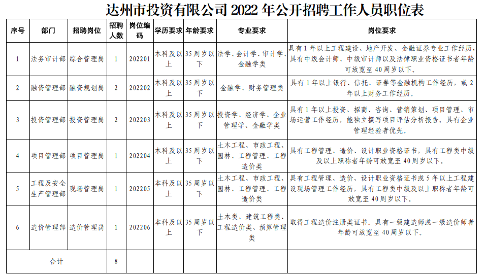 3.具備《達(dá)州市投資有限公司2022年公開招聘工作人員職位表》中具體招聘崗位要求的資格和條件;